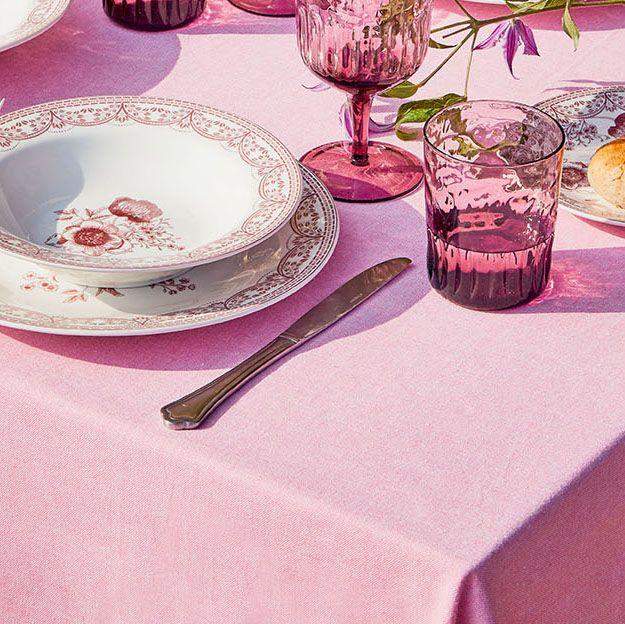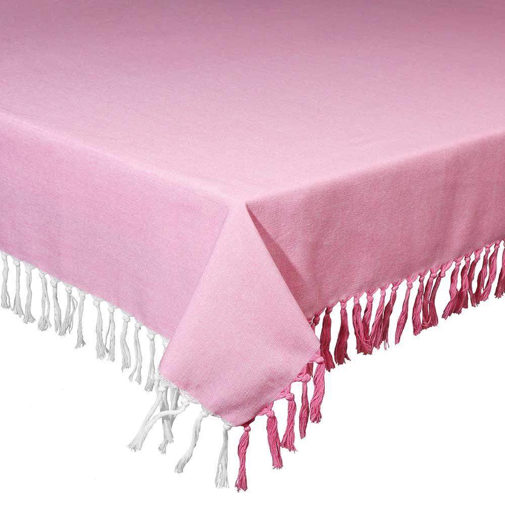 Stylowy obrus w kolorze pudrowego różu (baby pink), wykonany z wysokiej jakości bawełny. Delikatna, jednolita tkanina została wykończona ozdobnymi frędzlami w dwóch kolorach – różowym i białym