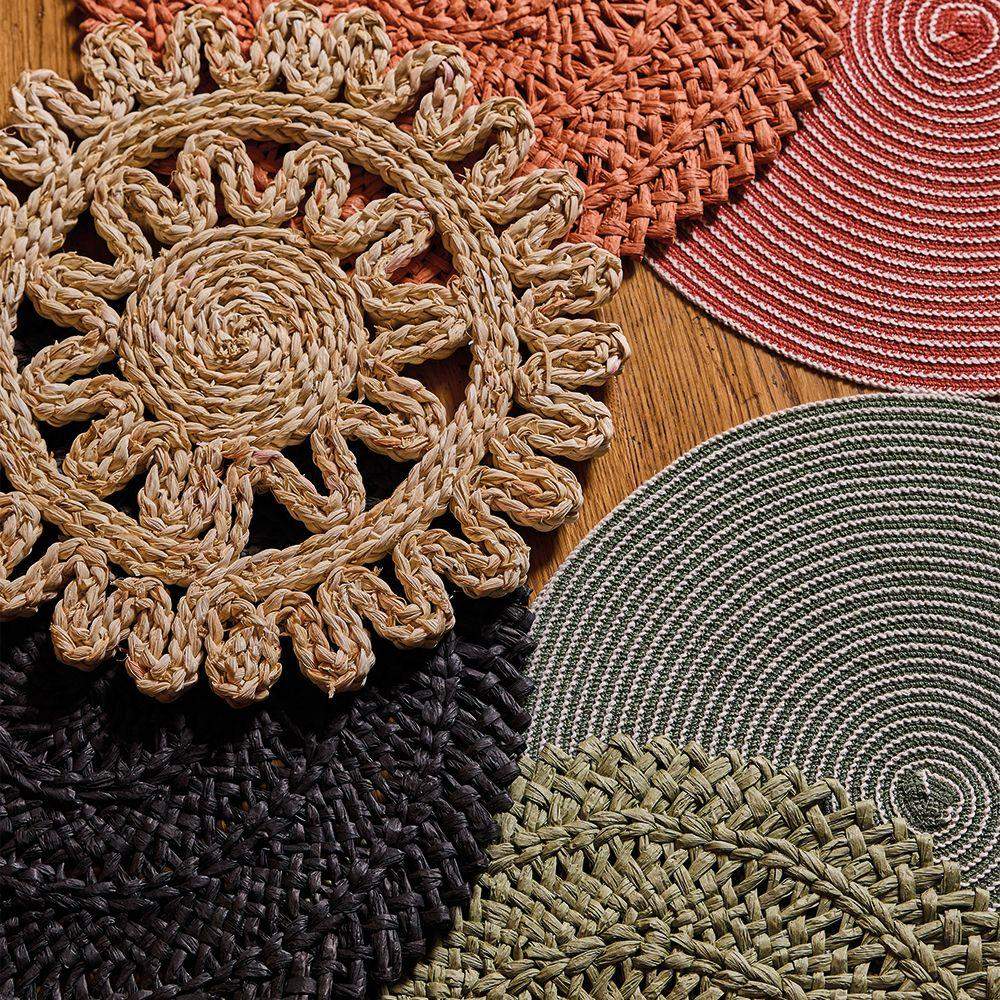 Ręcznie pleciona z naturalnych włókien dekoracyjna podkładka stołowa, wykonana z trawy.