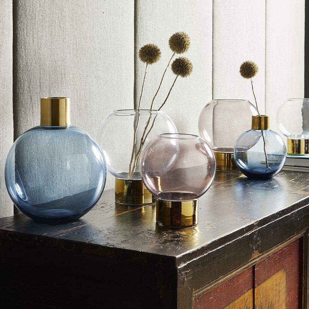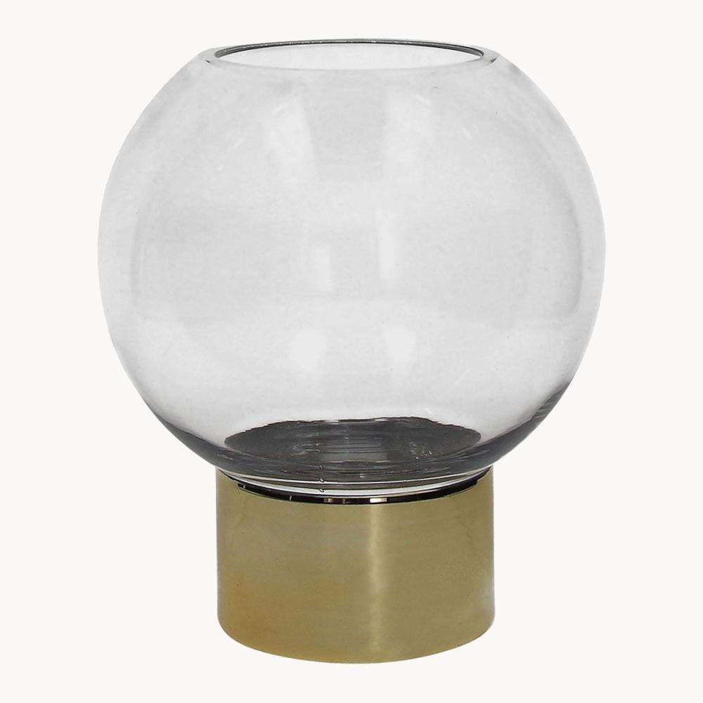 Nowoczesny wazon dekoracyjny z przezroczystego szkła, osadzony na eleganckiej, metalicznej podstawie w złotym odcieniu.
